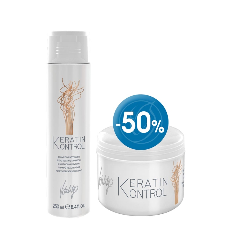 -50% 13027 Реактивираща кератинова маска: Маската е специално формулирана, за да поддържа ефекта от терапията Кератин Контрол в домашни условия. Обогатена е с кератин и копринени протеини за възстановяване на косъма. Косата изглежда здрава, мека и гладка като коприна. Активни съставки: глиоксилова киселина, кератин, копринени протеини.