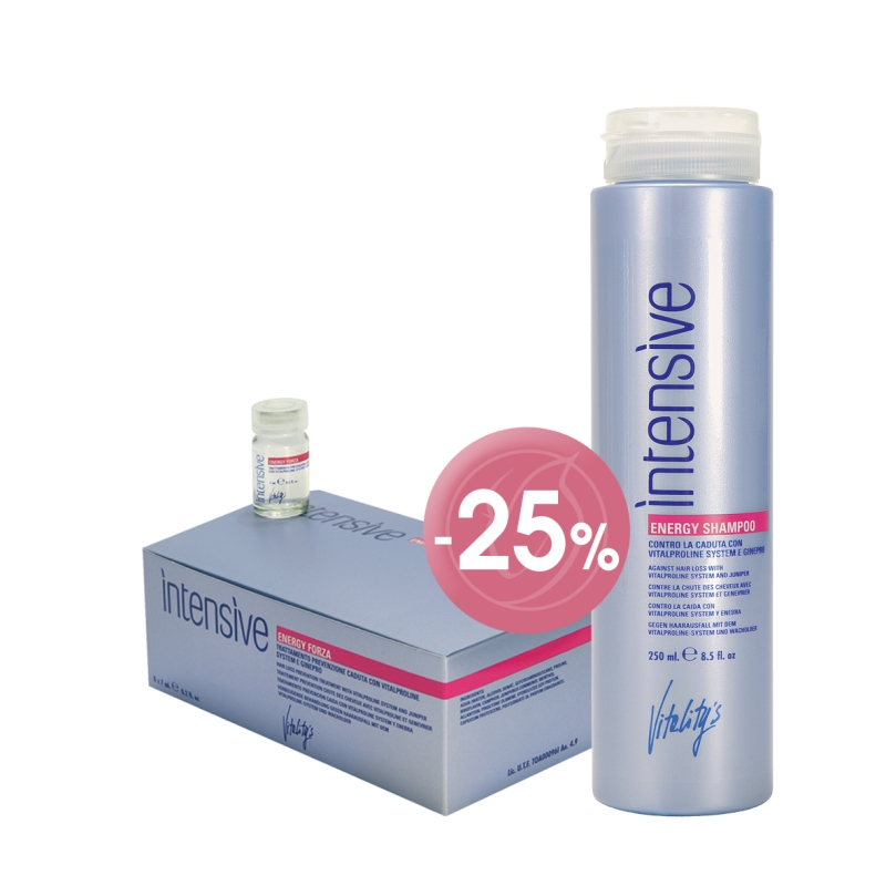 -25% 12148 Енергизиращ шампоан против косопад: Стимулиращ шампоан, който нежно измива косата и скалпа и има изключително тонизиращо действие. Енергийният комплекс Vitalproline е ефективна система от активни съставки, които действат против косопад и същевременно стимулират обновителния растеж. Натуралният екстракт от хвойна и витамин В2 осигуряват невероятна жизненост на косата, имат стимулиращо и защитно действие. Алантоинът успокоява, а екстрактът от гуар възстановява плътността на хидролипидния слой. Препоръчва се да нанася на косата и скалпа със стимулиращ масаж.