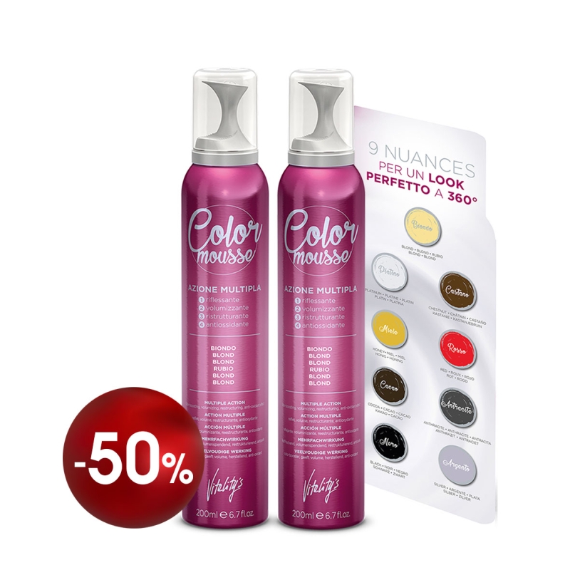 010 Цветна пяна за реструктуриране и обем: Цветна пяна е идеалния помощник на жените за ежедневна подръжка на косата и нейния цвят в перфектен вид. Съдържа пигменти, които внасят едновременно цвят и блясък. Екстрактът от зърна на нар е богат на витамини, минерали и танини, защитава косъма, цвета и блясъка му. Има мощно антиоксидантно и подмладяващо действие. Екстрактът от невен и маслото от ливадина хидратират, укрепват и реструктурират косъма, придават блясък и обем на косата. Пяната е идеална за: подсилване на тоналността, придаване на блясък, включване на отблясъци по дължините и в краищата, освежаване на цвета между боядисванията, хармонизиране на жълто и сиво, покриване на първи побелели коси, придаване жизненост на косата. Не утежнява, защитава косата от агресията на външната околна среда, придава блясък, обем, гъвкавост и еластичност на косъма. Предлага се в 9 цвята: русо, платина, акациев мед, какао, кестеняво, червено, антрацит, сребро, черно.
