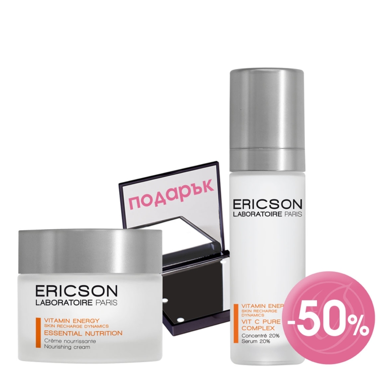 -50% E1861 Съживяващ серум с 20% витамини С: Серумът събужда уморената кожа, неутрализира свободните радикали, изсветлява тена и придава блясък, благодарение на високата концентрация от 20% чист, стабилизиран витамин С. Текстурата е фина, абсорбира се бързо и не омазнява. Съдържа мощен енергиен стимулатор HTAC booster, богат на растителен таурин, който съживява и защитава кожата и Fucogel за незабавна и дълготрайна хидратация.